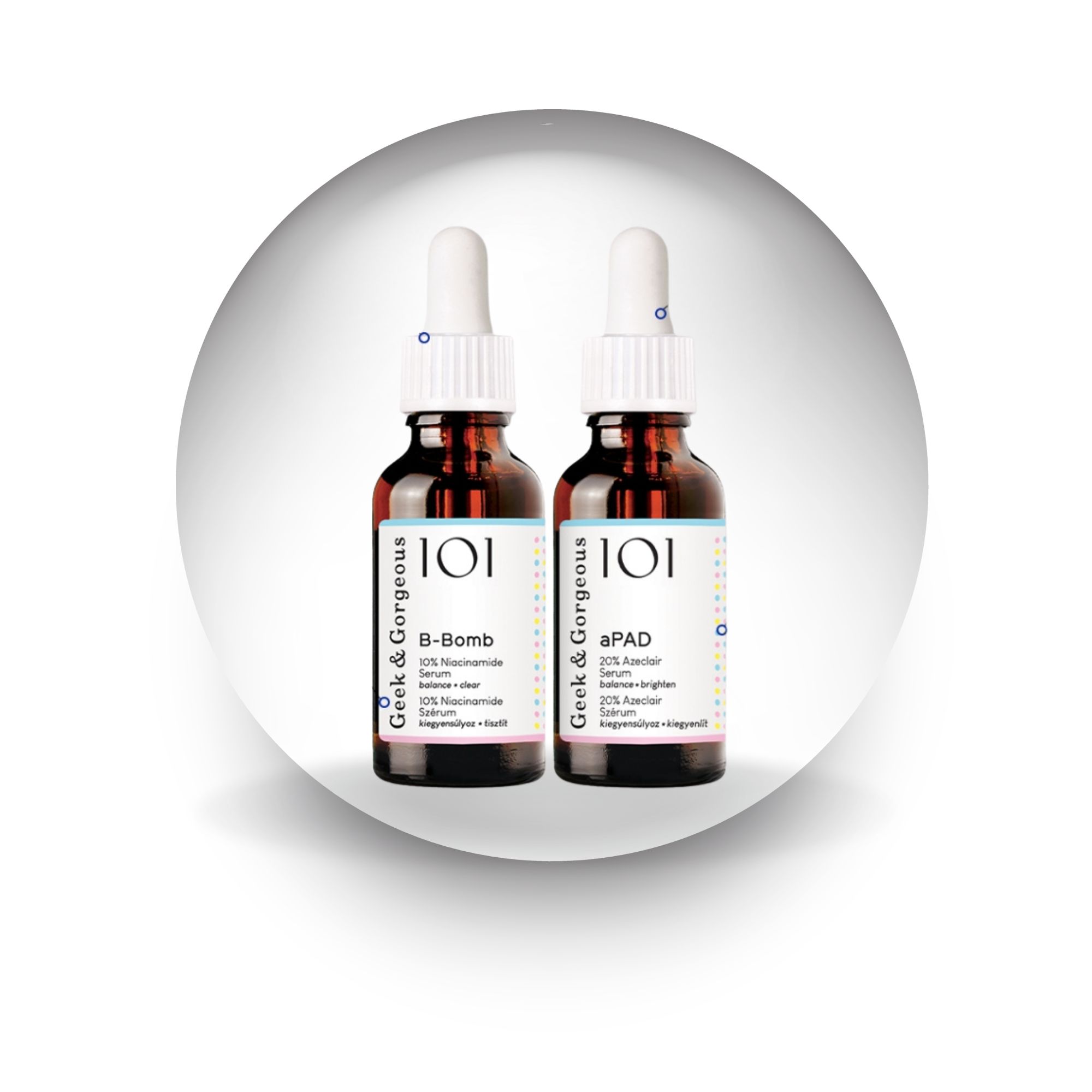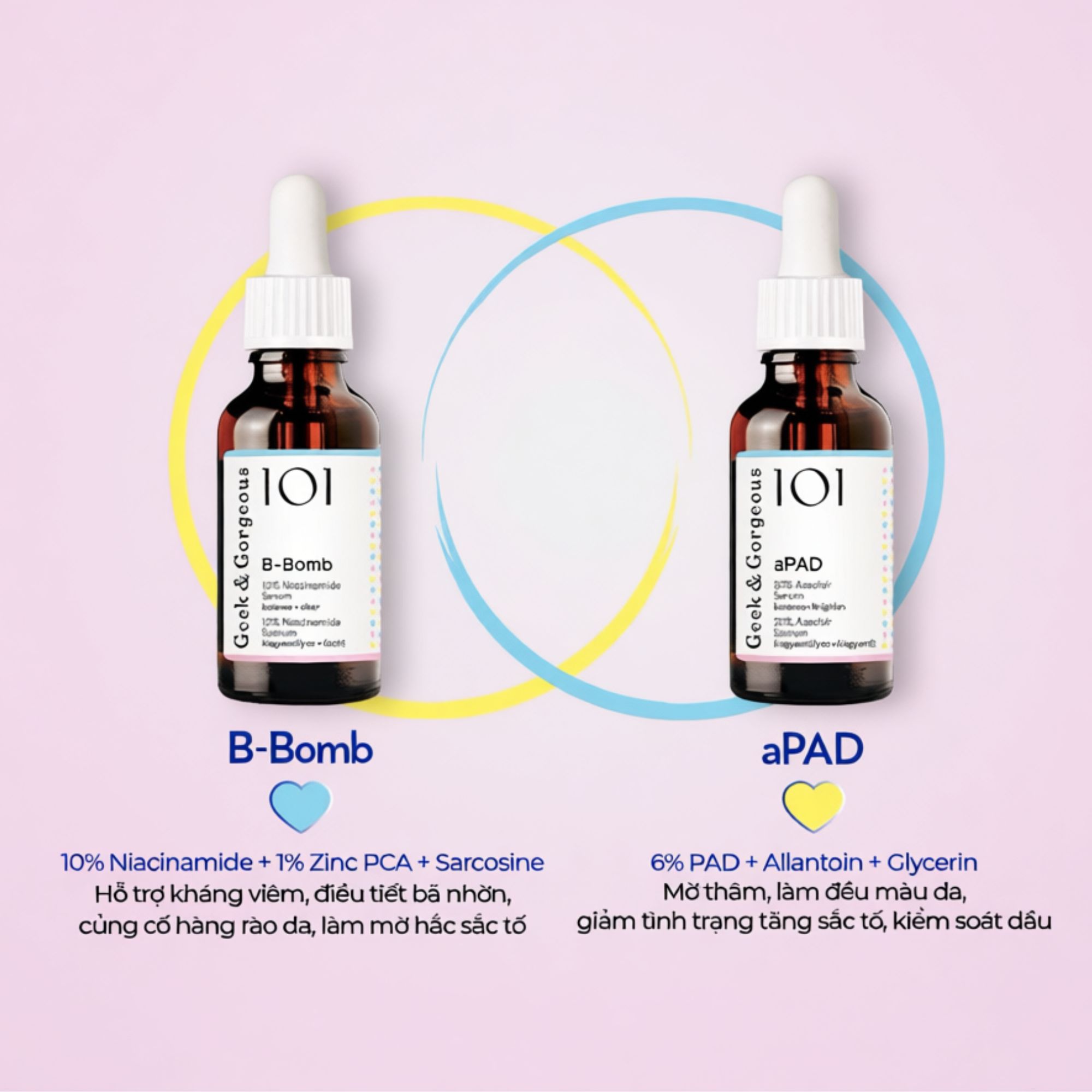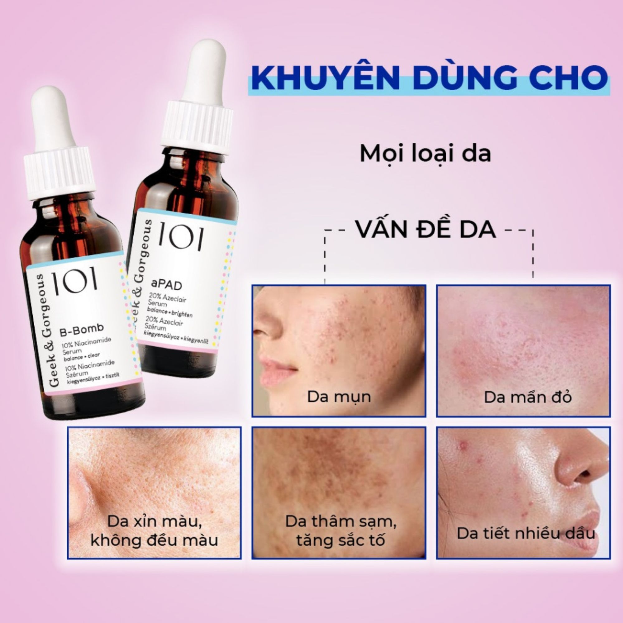 - Bộ đôi tinh chất Geek&Gorgeous B-Bomb + aPAD mang đến giải pháp toàn diện cho làn da đang gặp phải vấn đề mụn và thâm nám.
