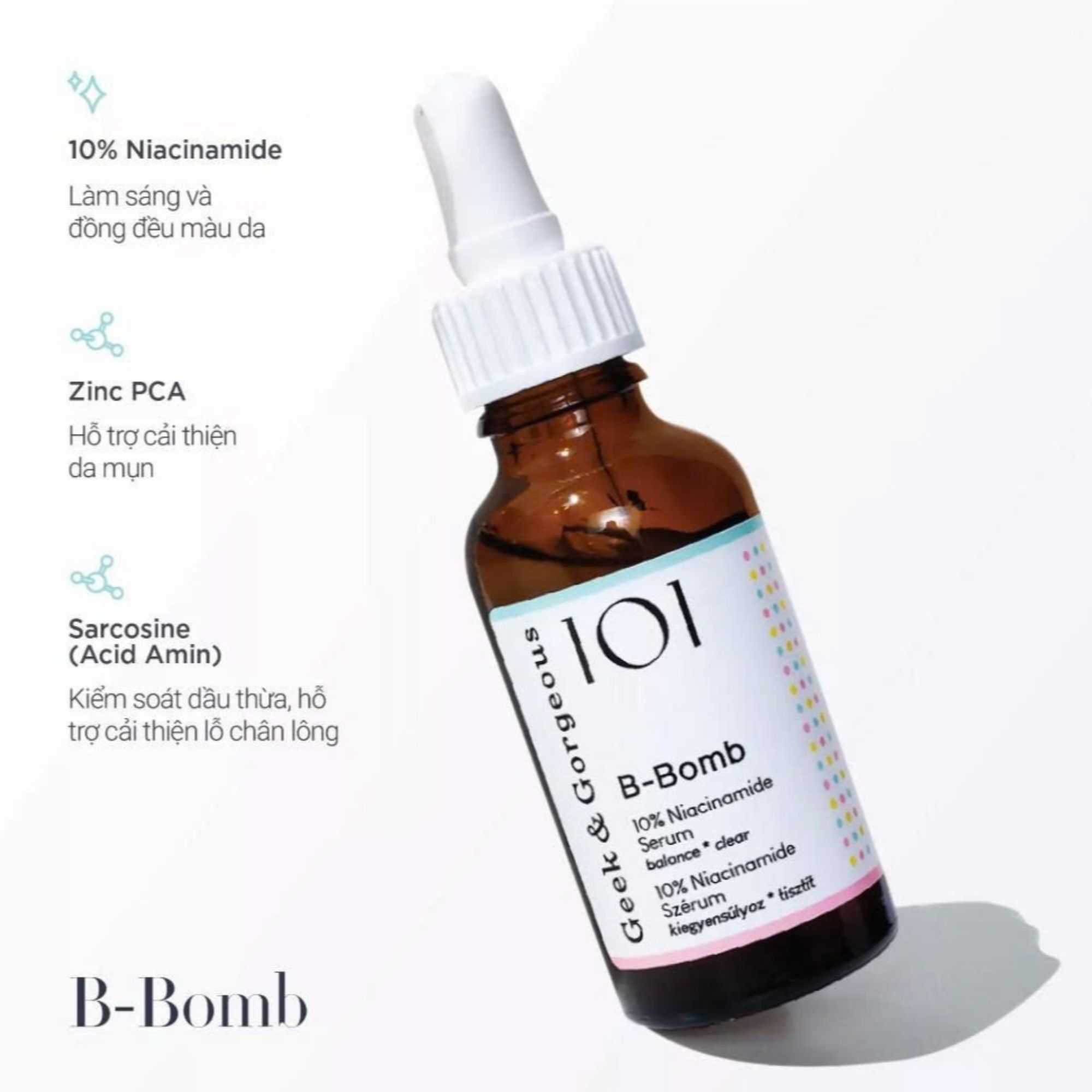 - Với công thức được nghiên cứu kỹ lưỡng, B-Bomb chứa 10% Niacinamide cùng Zinc PCA giúp kiểm soát tình trạng da bóng dầu và lỗ chân lông to một cách hiệu quả.