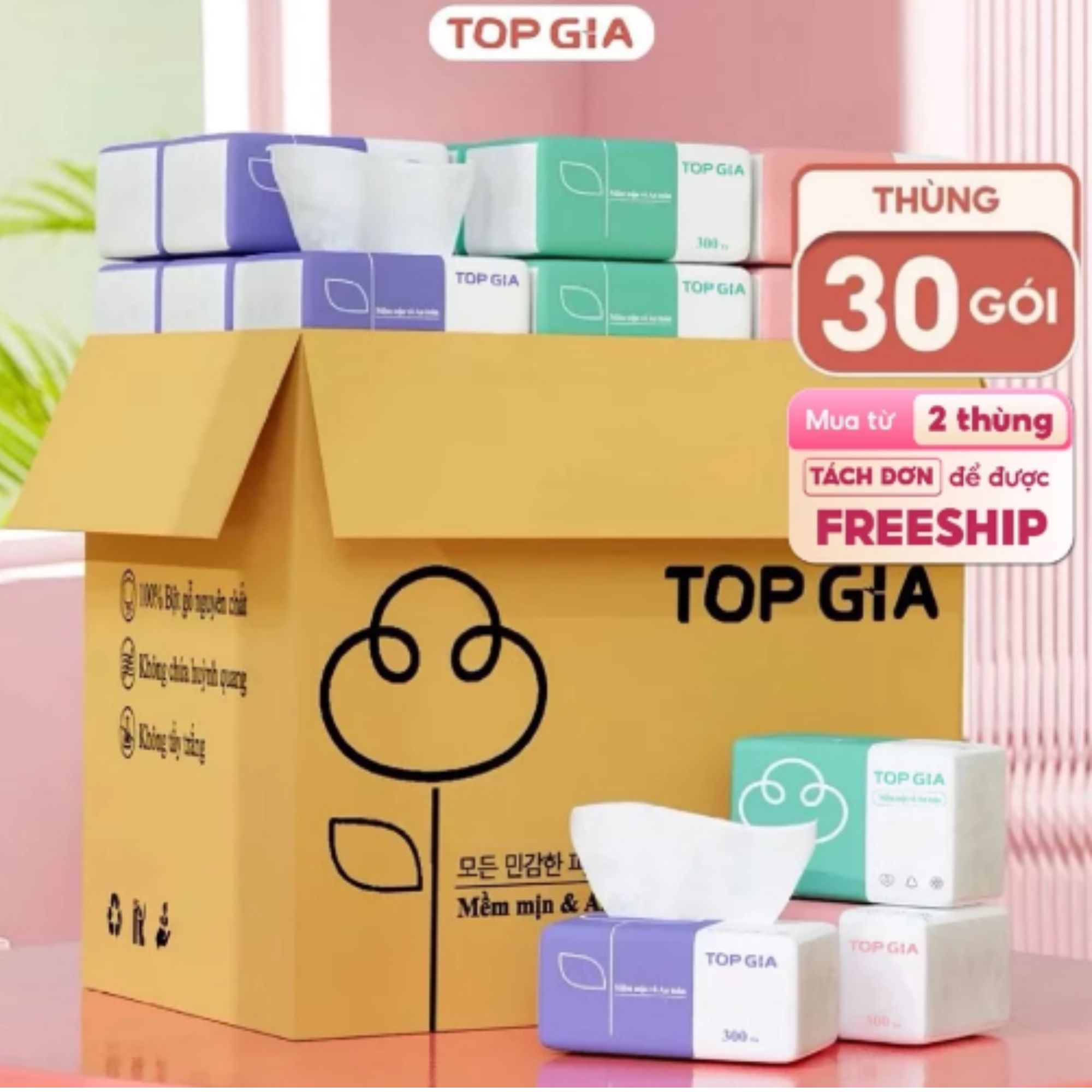 Giấy ăn rút Top Gia 3 màu cao cấp 4 lớp dày dặn, mềm mịn (Thùng 30 gói)