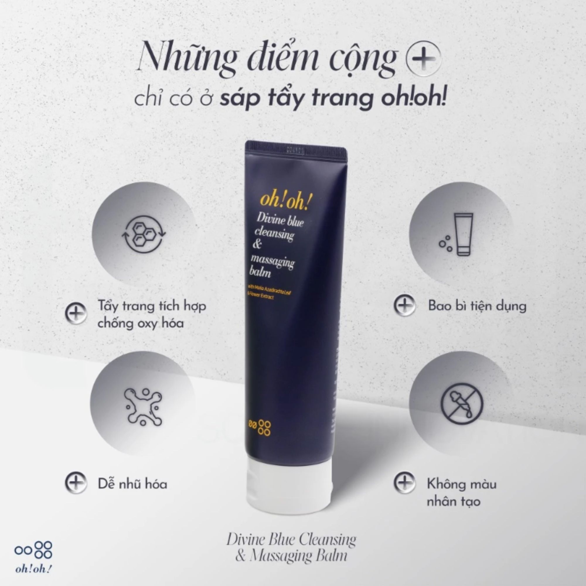 - Oh!Oh! Divine Blue không chỉ là sản phẩm tẩy trang thông thường mà còn kiêm luôn kem massage thư giãn cho khuôn mặt. Kết cấu sáp mềm mịn tan chảy khi tiếp xúc với da, tạo cảm giác dễ chịu và thư giãn tuyệt vời sau ngày dài mệt mỏi.